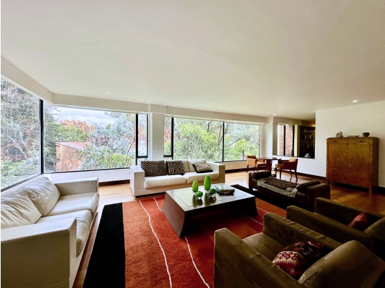 Ingresamos directamente a la zona social por el ascensor privado, los amplios ventanales aportan excelente iluminación y vista verde al bosque. Tenemos la gran sala con chimenea tradicional, el estudio con salida a un balcón, el comedor independiente, y el baño de visitas completo. Pasamos a una amplia cocina cerrada con isla y espacio para comedor de diario, seguidamente se encuentra la zona de lavandería y el cuarto y baño de servicio completo.
